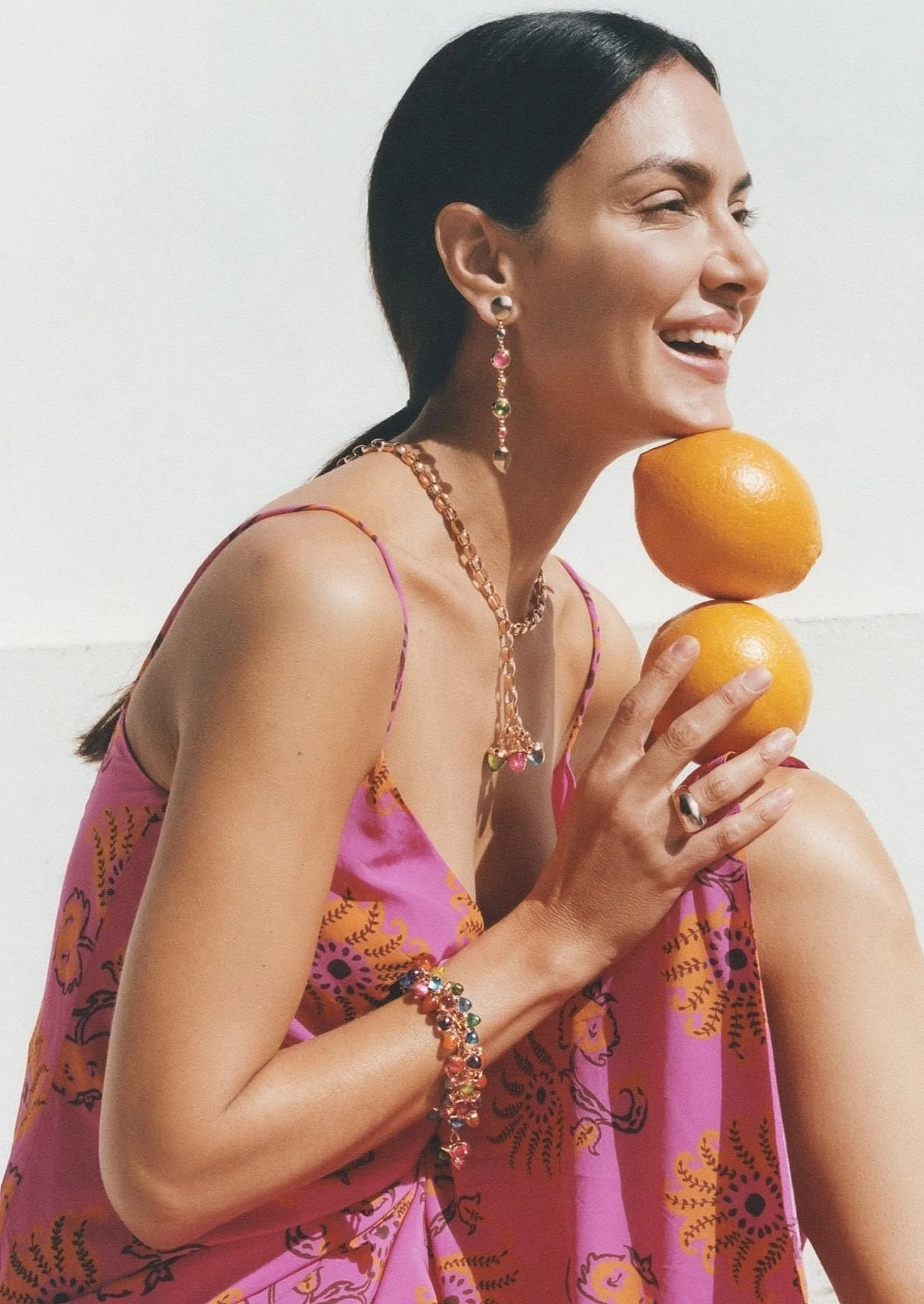 inlaid turquoise, malachite, and white onyx with pops of bright pink and orange to remind us of the glimmering ocean and summer sunsets all year round